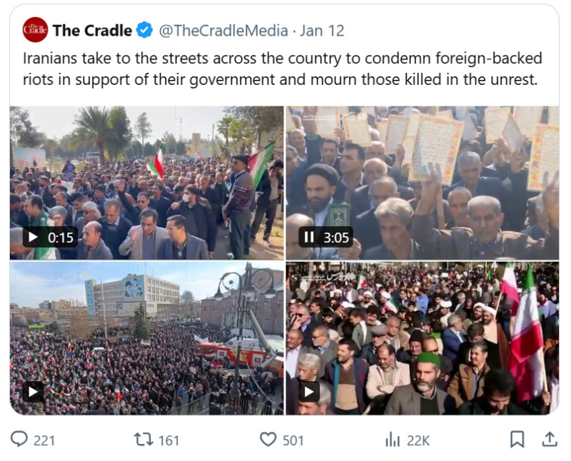 Les rassemblements massifs en faveur du gouvernement démontrent une légitimité assez forte, une base électorale organisée et une ampleur sans précédent, mais les médias occidentaux les ignorent largement. Citons par exemple les rassemblements en faveur de la République islamique exprimant l'indignation face aux meurtres de membres de familles et de fonctionnaires tués par des émeutiers et des gangs ; ces foules ont largement dépassé en nombre l'opposition, avec une énergie, un dynamisme et une détermination bien plus grands.