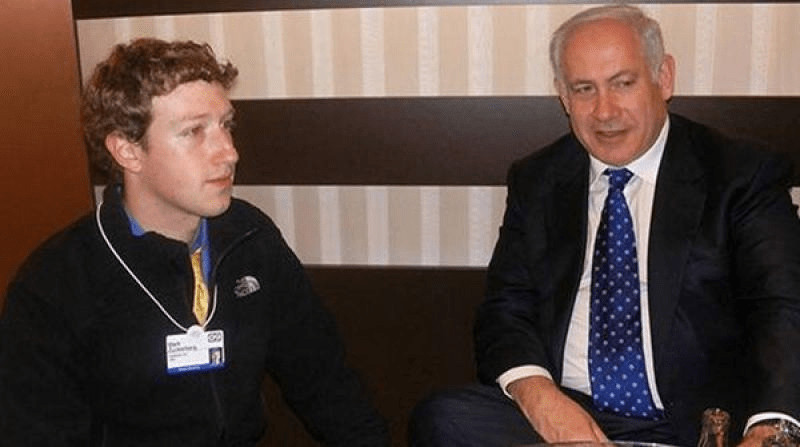 Mark Zuckerberg, propriétaire de Meta (qui détient Facebook, Instagram, WhatsApp, Threads et Reality Labs), est photographié ici avec le Premier ministre israélien Netanyahou. Zuckerberg emploie des dizaines d'anciens soldats et agents de renseignement israéliens pour aider à contrôler les contenus en ligne.