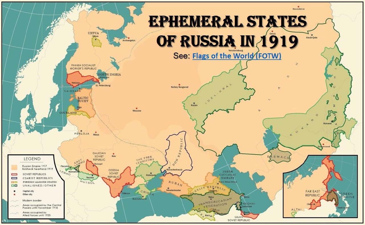 Chi vuole dare esempio di minimalismo, moderazione e realismo, si limita alla frammentazioneseguita alla Rivoluzione di ottobre. La guerra civile che devastò il paese dal 1918 al 1920 fu alimentata dalle generose donazioni dell'Occidente democratico e vide il sorgere di vari staterelli (vedi figura sotto). Non mancano mappe immaginarie più complesse e ardite. Sono quelle fantasticate da chi, pur diversamente adolescente, frequenta il gioco del Risiko con assiduità. E mira a conquistare la Jacuzia.