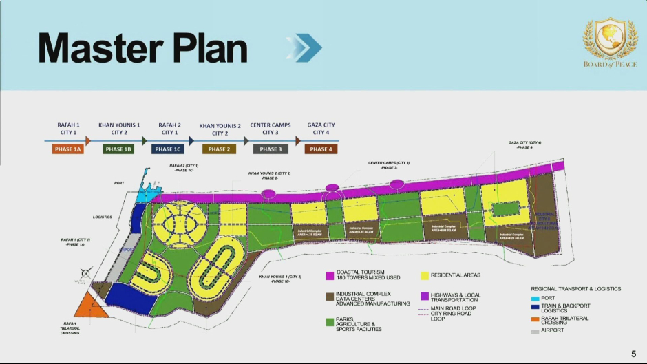 Le plan colonial Trump pour Gaza : • Jaune : zones résidentielles • Vert : agriculture et jardins • Brun : complexes industriels • Violet : infrastructures touristiques • Gris : aéroport • Bleu : port maritime • Orange : terminal de passage/frontière