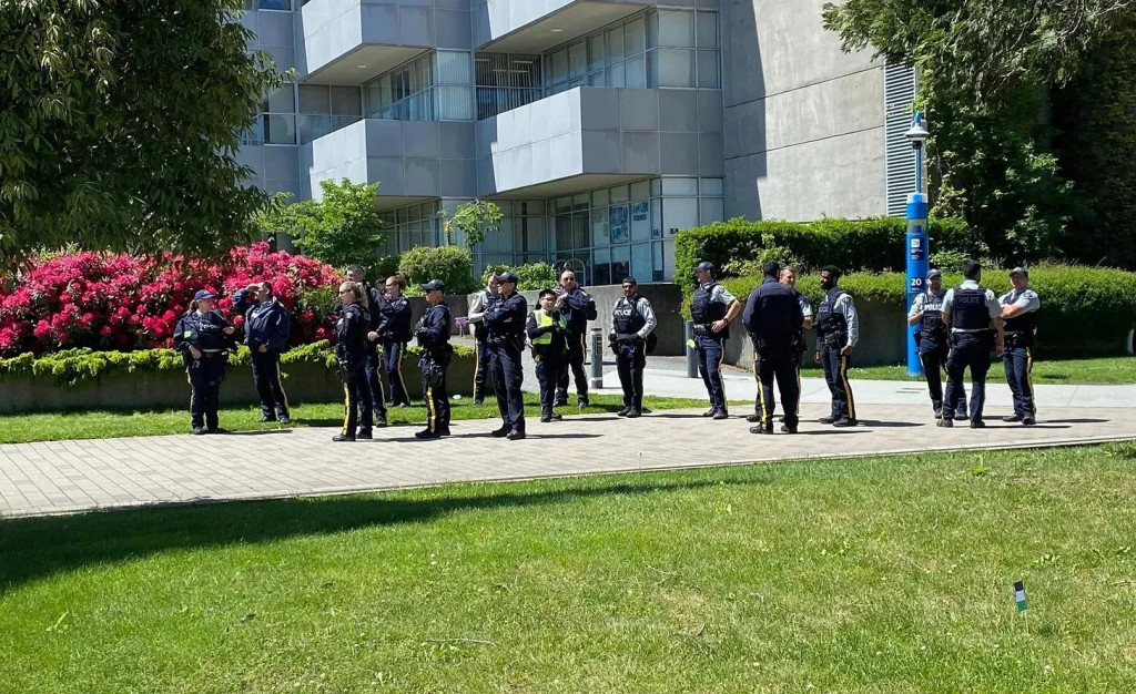 La Royal Canadian Mounted Police (GRC) se rassemble avant la cérémonie de remise des diplômes à l'université de Colombie-Britannique, illustrant l'une des nombreuses répressions de la liberté d'expression dans diverses universités canadiennes. Crédit photo : Université populaire pour Gaza à l'UBC.