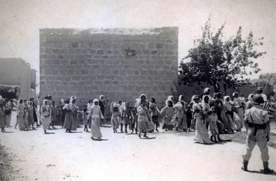 Soldats israéliens avec des femmes et des enfants palestiniens détenus à Tantura le 23 mai 1948, date du massacre de Tantura. Crédit photo : domaine public
