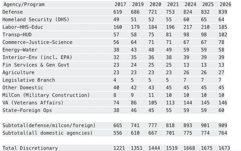 But what is truly obscene is that the GOP appropriations committee members voted 34 to 0 in favor of 2026 domestic spending levels in the January 8th minibus that make an absolute mockery of the DOGE boys. Indeed, these bloated domestic spending levels belie every speech these cats ever made in behalf of fiscal sanity-especially when they voted "yea" on the budget-buster called OBBBA, and did so on the grounds that they would get around to spending cuts right soon after the July 2025 signing ceremony.