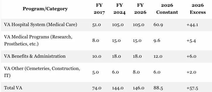 Finally, we have the real elephant in the room. We are referring to Obama's $74 billion 2017 budget for discretionary Veterans Administration (VA) programs, which would be nearly $89 billion in FY 2026 if it had been fully funded for inflation.