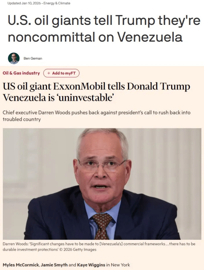 Il apparaît chaque jour plus clairement que Trump n'a guère accompli grand-chose au Venezuela, si ce n'est l'enlèvement d'un dirigeant pour des raisons purement personnelles. Nous avons déjà constaté comment les compagnies pétrolières américaines ont affirmé sans ambages à Trump que le Venezuela était un pays où il était impossible d'investir sans une restructuration majeure de sa réglementation, ce qui revient à dire que Delcy devrait accepter de vendre son pays et de reprivatiser ses actifs - une perspective de plus en plus improbable.