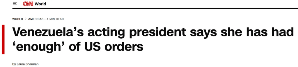 «La présidente par intérim du Venezuela, Delcy Rodríguez, a déclaré dimanche qu'elle en avait «assez» des ordres de Washington, alors qu'elle s'efforce d'unir le pays après le kidnapping par les États-Unis de son dirigeant, Nicolás Maduro.