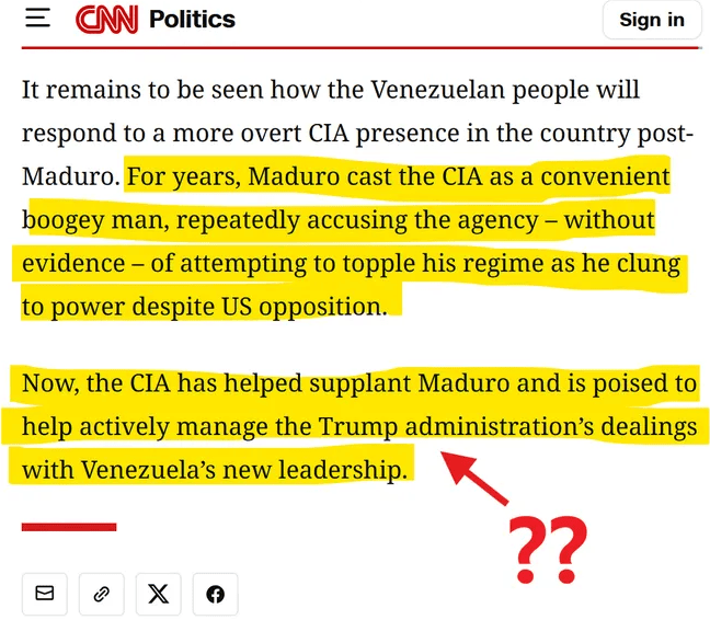 «C'est là l'un des passages les plus extraordinaires et révélateurs de toute l'histoire du journalisme. CNN dépeint Maduro comme un menteur paranoïaque qui prétend que la CIA cherche à le renverser. Pourtant, dans la phrase suivante, la chaîne note nonchalamment que la CIA l'a bel et bien renversé. Le degré de dissonance cognitive et de dégénérescence intellectuelle qu'il faut avoir pour écrire une chose pareille, et la faire lire par un rédacteur en chef et publier, est tout simplement sidérant».