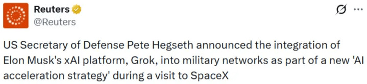 Enfin, sur un dernier point connexe, Hegseth annonce que l'armée américaine va désormais intégrer l'IA Grok à ses réseaux de contrôle : un «progrès» incontestable ou une autre initiative farfelue de l'administration de l'Idiocratie ?