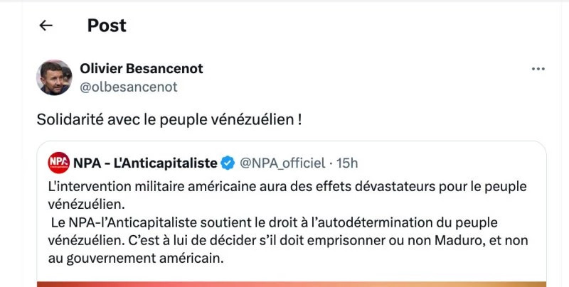 Co-auteur de Che Guevara : une braise qui brûle encore (Mille et une nuits, 2007), Olivier Besancenot lève un poing audacieux tout en évitant précautionneusement de brûler ses petits doigts dans la braise : « Le NPA-l'Anticapitaliste soutient le droit à l'autodétermination du peuple vénézuélien. C'est à lui de décider s'il doit emprisonner ou non Maduro, et non au gouvernement américain ». Besancenot ne précise pas si les Vénézuéliens doivent également envisager l'incarcération de Delcy Rodríguez, proche collaboratrice de Maduro. Le côté féministe du dirigeant néo-trotskiste, vraisemblablement (bien que le sort de Cilia Flores ne semble guère le préoccuper).
