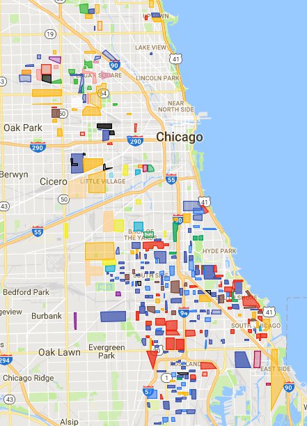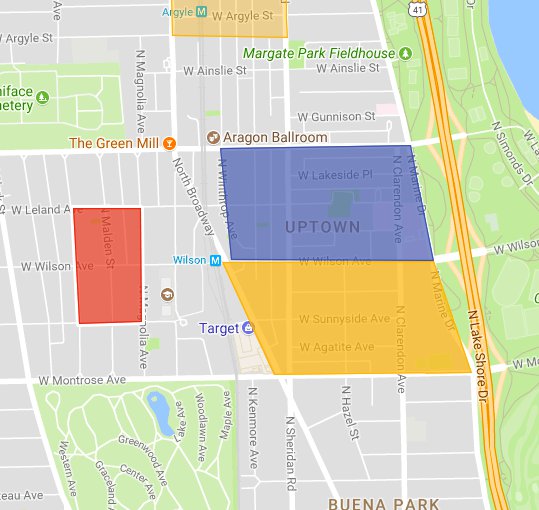 That's the Uptown neighborhood on the Northside. The red area is "Black P Stone" territory, according to this map at least. Blue is the Uptown Gangster Disciples, and the yellow is the Uptown Lawds. (I'm getting all of this info from the website I linked to up there.) According to that website, the GD's and UL's have had some friction lately, probably because they share a common border.