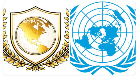 Le logo du « Conseil de la paix » de Trump, à gauche, est en fait le logo de l'ONU repeint couleur or, et le monde est réduit à la seule Amérique du Nord.