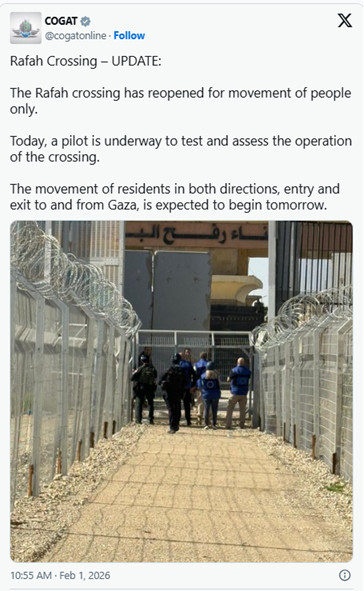 Quds News Network, 1er février 2026.- Une photo du point de passage de Rafah entre Gaza et l'Égypte, circulant sur les réseaux sociaux, montre l'entrée grillagée de ce point de passage, deux ans après le génocide. Un nombre limité de Palestiniens sera autorisé à y entrer et à en sortir, sous réserve de contrôles de sécurité et d'un point de contrôle militaire israélien.