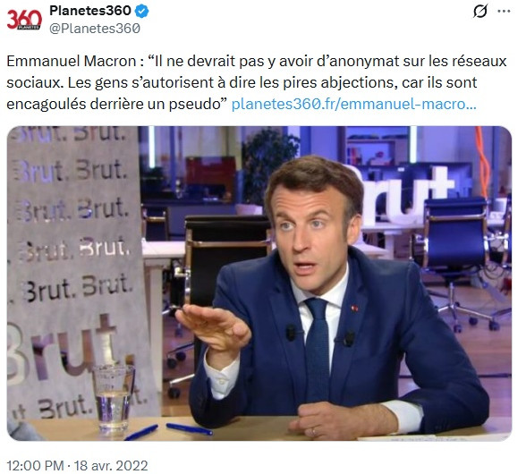 En pratique, cette volonté de supprimer toute opposition politique des réseaux sociaux n'est pas nouvelle et Macron a amplement démontré sa volonté de contrôler ces réseaux et d'y supprimer toute dissidence d'opinion depuis qu'il est arrivé en poste, il y a 8 ans. Et pour ne remonter qu'en 2022, il déclarait ainsi qu'«il ne devrait pas y avoir d'anonymat sur les réseaux sociaux. Les gens s'autorisent à dire les pires abjections, car ils sont encagoulés derrière un pseudo».