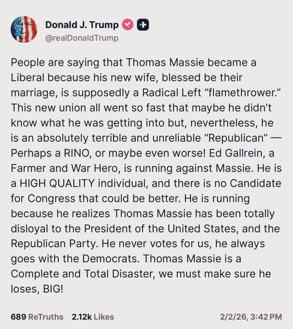 (1) Thomas Massie has the most conservative voting record in the entire Congress, so he is not a "Liberal," especially in the sense Trump means.