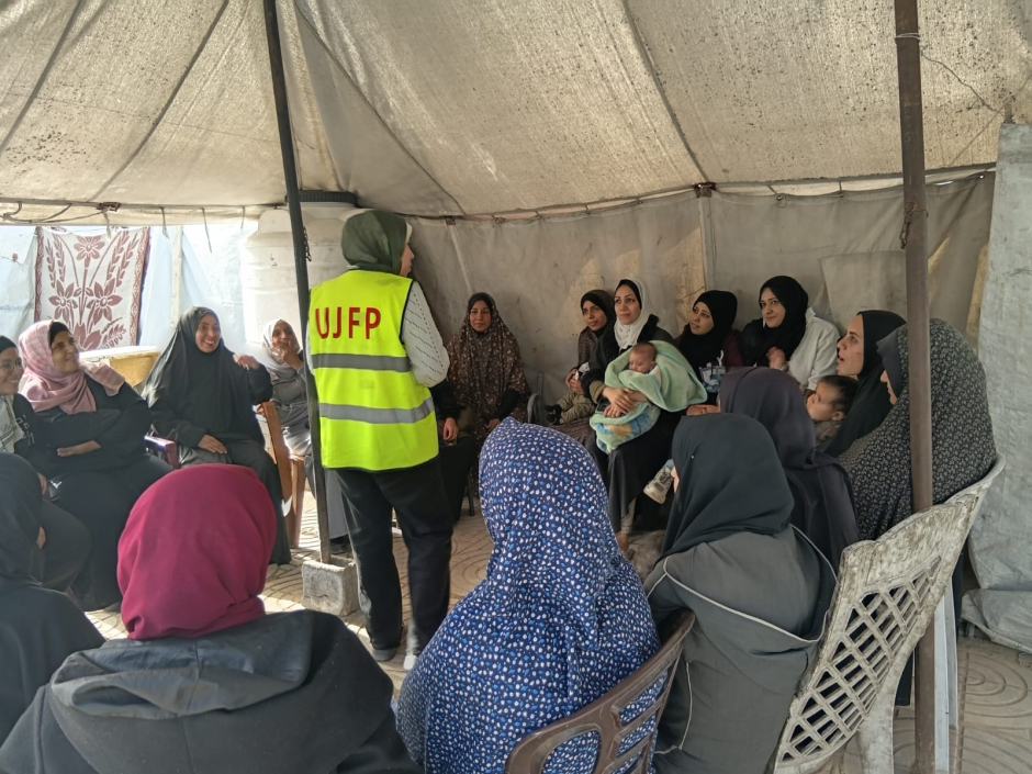 Cette séance au camp d'Al-Katiba s'inscrit dans la continuité d'un travail soutenu mené par l'équipe de l'UJFP dans différentes régions de la bande de Gaza, allant de la protection de l'enfance à Deir al-Balah à l'autonomisation des femmes au cœur de la ville, dans le cadre de la construction d'un système de protection intégré qui place l'être humain au centre de l'attention et renforce la conscience, la dignité et la résilience communautaire. Les femmes de Gaza affirment que, malgré la douleur, elles sont toujours capables de parler, de rêver et de créer l'espoir au cœur de la souffrance. »