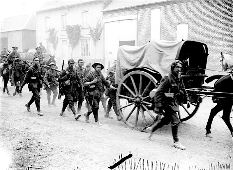 Pendant la bataille de la Somme pendant la Première Guerre mondiale, le régiment de l'East Yorkshire marcha vers la ligne de front, le 28 juin 1916. (Ernest Brooks, Imperial War Museums, Domaine public, Wikimedia Commons)