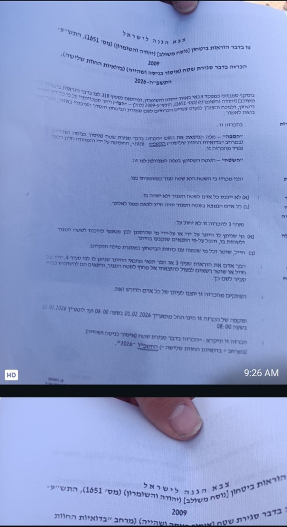 ISM-Palestine, 6 février 2026. Le 5 février - Deux citoyens françaiss ont fait appel d'un ordre d'expulsion après que les forces israéliennes les aient arrêtés le 1er février au domicile d'Abu Najeh à al-Khalayil, dans la banlieue d'al-Mughayer (à l'Est de Ramallah), pour avoir enfreint une ordonnance militaire. La transcription (document officiel disponible sur demande) de l'audience d'expulsion tenue le 1er février indique que l'État israélien a admis que la raison de l'ordre de CMZ (zone militaire fermée) était « l'expulsion des Bédouins qui occupent illégalement la région ». L'État admet ainsi officiellement sa stratégie démographique dans les terres qui sont sous le contrôle civil de l'Autorité palestinienne (zone B). En d'autres termes, l'État israélien recours à des mesures de sécurité pour atteindre des objectifs qui ne sont en aucun cas liés aux questions de sécurité.