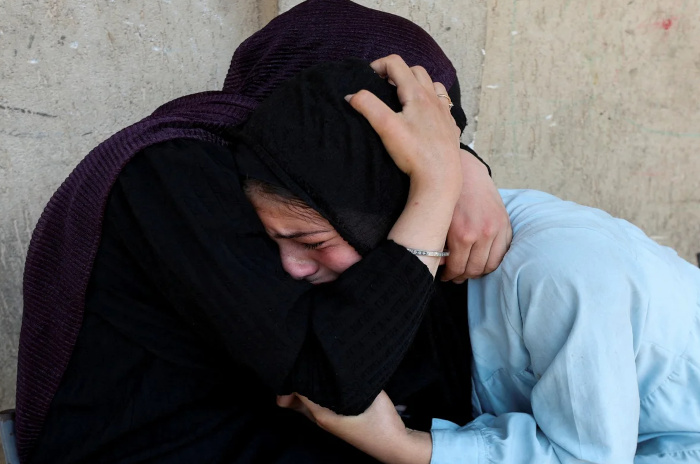 Des Palestiniennes tentent de se réconforter après une frappe aérienne israélienne sur une école de l'ONU abritant des personnes déplacées à Nuseirat, dans le centre de la bande de Gaza, le 14 juillet 2024 - Photo : Ramadan Abed