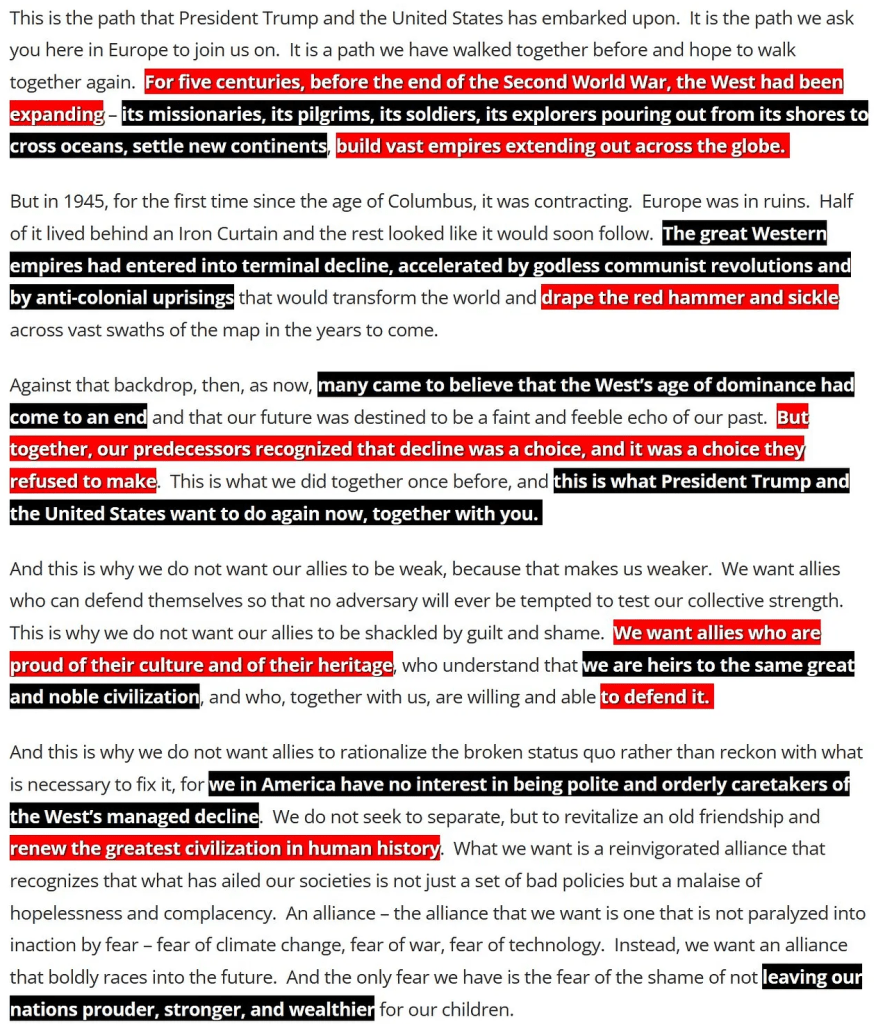 Son discours, empreint de colonialisme, circonscrit la nouvelle doctrine et le nouveau paradigme américains, que Rubio avait également développés lors de la Conférence de Munich sur la sécurité. Le discours de Rubio a suscité de vives réactions, car il semblait appeler la "civilisation" américano-européenne à reprendre les rênes de la domination mondiale. Ben Norton écrit :