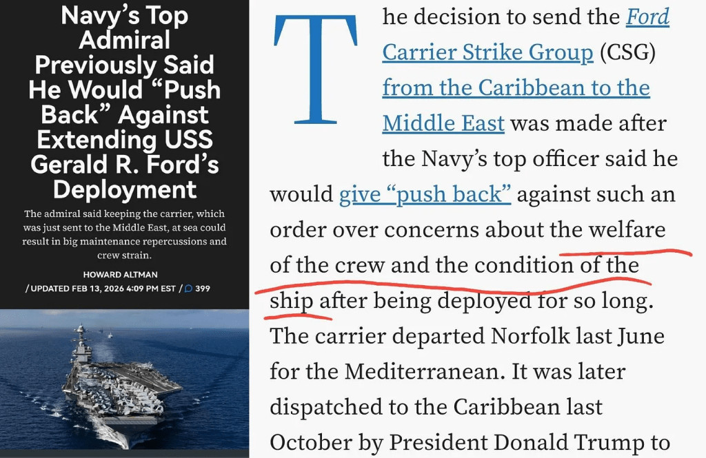 Cela peut paraître invraisemblable au premier abord, jusqu'à ce que l'on réalise que les plus hauts responsables de la Marine avertissent depuis des mois que les changements radicaux opérés par Trump concernant les groupes aéronavals suscitent de vives inquiétudes quant à l'intégrité de ces navires vieillissants [1] :