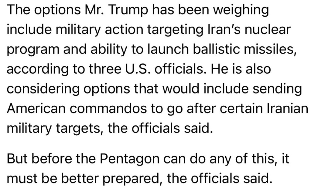 "Parmi les options envisagées par le président américain Donald Trump figure une action militaire visant le programme nucléaire iranien et sa capacité à lancer des missiles balistiques. Des responsables américains indiquent qu'il étudie également la possibilité d'envoyer des commandos américains attaquer certaines cibles militaires iraniennes".(NYT)