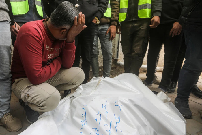 21 janvier 2026 - Les Palestiniens de l'hôpital Al-Shifa de Gaza City pleurent trois journalistes - Anas Ghunaim, Abdelraouf Shaat et Muhammad Qishta - tués par une frappe aérienne israélienne. Les trois hommes ont été tués lors d'une attaque ciblée contre leur voiture alors qu'ils étaient en mission dans le centre de Gaza pour le compte du Comité égyptien de secours - Photo : Yousef Zaanoun / ActiveStills