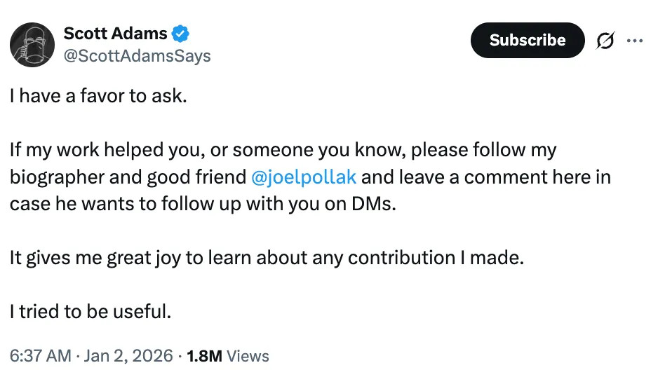 Me: Hi Scott, I asked ███ to pass this along to you. When I saw Trump's 2015 response to the Rosie O'Donnell question at the first debate, I felt there was a real likelihood he'd win, and soon after I found your blog. Since then I've learned a ton from it and the perspectives I got from you were one of the things that made my newsletter possible. I wanted to thank you for the numerous times you've shared my work on X, and I wish you the best of luck with everything.Scott: Thanks for passing that along. I'm so glad I helped.Me: Thanks; you helped me a lot, and I will do my best to pay it forward.