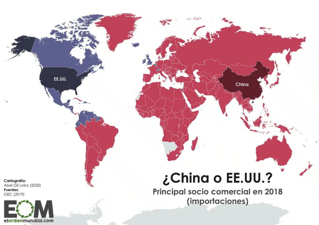Pour des objectifs géostratégiques similaires à ceux qui motivent leur politique envers l'Iran ou le Venezuela : les approches peuvent varier selon les contextes, mais l'objectif fondamental reste le même; maintenir une influence dominante sur des régions riches en ressources, stratégiquement situées et susceptibles de remettre en question l'ordre mondial dirigé par Washington. Actuellement si l'on considère la carte ci dessous on voit à quel point la Chine est le premier partenaire de la plupart des pays dans le monde. Au début des années 2000, la part de la Chine dans le commerce international ne dépassait pas 25% ; elle représenterait aujourd'hui les trois quarts. Par ailleurs, le Centre britannique de recherche économique et commerciale (CEBR) estime que la Chine dépassera l'économie américaine au cours de cette décennie, aux alentours de 2028. Il y a le cas de l'UE et de l'Europe de l'Ouest, avec les stratégies erratiques de la Grande Bretagne, Allemagne et France, mais aussi celui des territoires sur lesquels, la France et la Grande Bretagne exercent un droit colonial ou prétendent l'exercer.