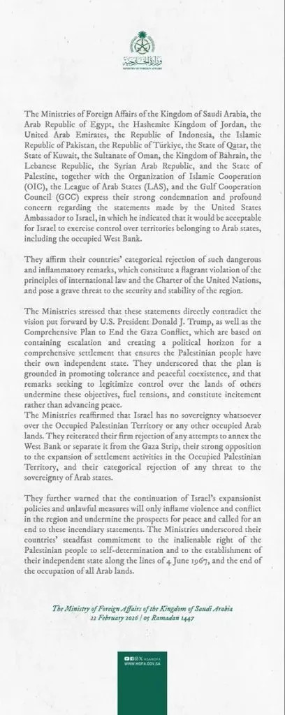 La Jordanie et l'Arabie saoudite accueillent actuellement des centaines d'avions de combat américains et des avions-citernes qui ravitaillent ces avions. Est-ce que cela veut dire qu'ils bloqueront toute tentative américaine de lancer une attaque depuis leur territoire ? Peut-être. À noter que les Saoudiens et les Émiratis ont signé cette sévère condamnation alors qu'ils se sont copieusement écharpés ces deux dernières semaines. C'est la condamnation collective la plus virulente contre Israël depuis le début du génocide à Gaza.