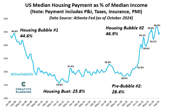 The cost of buying/owning a home is higher than previous eras, requiring far more hours of work to pay the mortgage, property taxes, home insurance, maintenance and other costs.