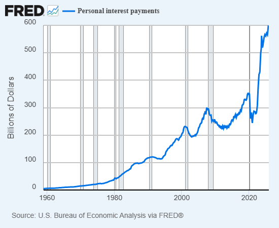 As debt becomes the norm to afford a middle-class quality of life, an increasing share of wages is devoted to debt service/interest. Recall that every student loan and mortgage is a debt to the borrower but an income-producing asset to the owner of the loan.