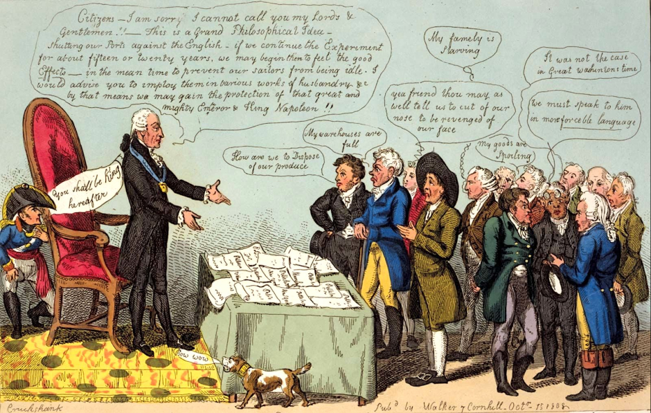1808 British political cartoon ridiculing the 'Embargo Act of 1807'. President Thomas Jefferson reassures his petitioners, ruined businessmen, that the embargo on warring Europeans may show good results in 15 to 20 years. (British Cartoon Prints Collection/U.S, Library of Congress/Wikimedia Commons)