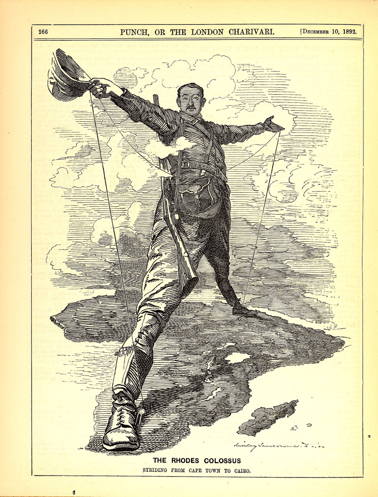 Le Colosse de Rhodes - Marchant du Cap au Caire : Caricature de Cecil John Rhodes, après l'annonce de son projet de ligne télégraphique et de chemin de fer reliant Le Cap au Caire. Publiée dans Punch, ou le London Charivari, le 10 décembre 1892. (Collections numériques de la bibliothèque de l'université Cornell, provenant de Persuasive Maps/Wikimedia Commons)