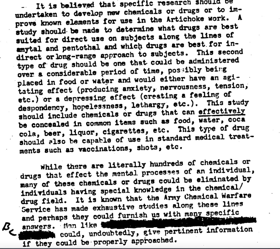 The recently published document titled "Special Research for Artichoke" is consistent with the suspicion that the CIA was seeking to discover mind control methods for even large populations. Especially chilling is the document's assertion, "This type of [mind control] drug should also be capable of use in standard medical treatments such as vaccinations, shots, etc."