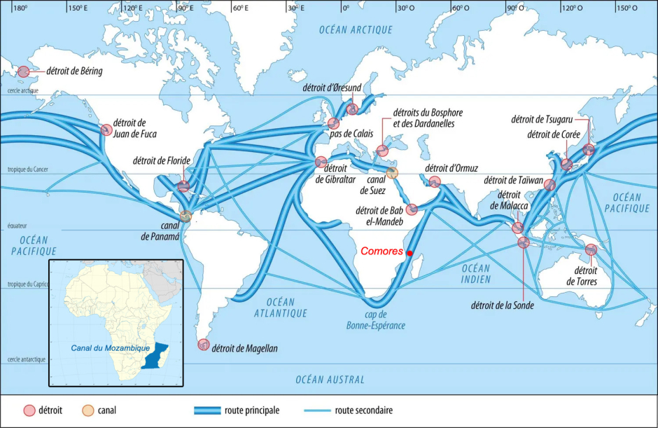 Sur le plan maritime, l'île est située à proximité des routes qui relient le Moyen-Orient, l'Asie et l'Afrique australe. Selon le Dr Djandi, environ 80 % du pétrole mondial en provenance des pays du Golfe transite par le canal du Mozambique, ainsi que plus de 30 % du commerce mondial. Contrôler cette voie, c'est disposer d'un point d'observation et de pression sur l'un des corridors maritimes les plus vitaux de la planète.