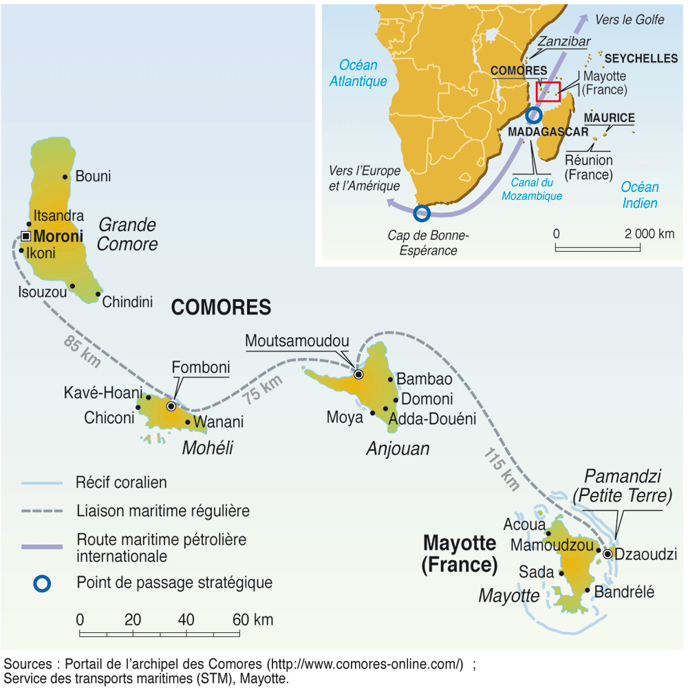 L'archipel des Comores est composé de quatre îles : Grande Comore (Ngazidja), Anjouan (Ndzuwani), Mohéli (Mwali) et Mayotte (Maore). Colonie française depuis 1841, l'archipel a été conduit vers l'indépendance dans les années 1970.