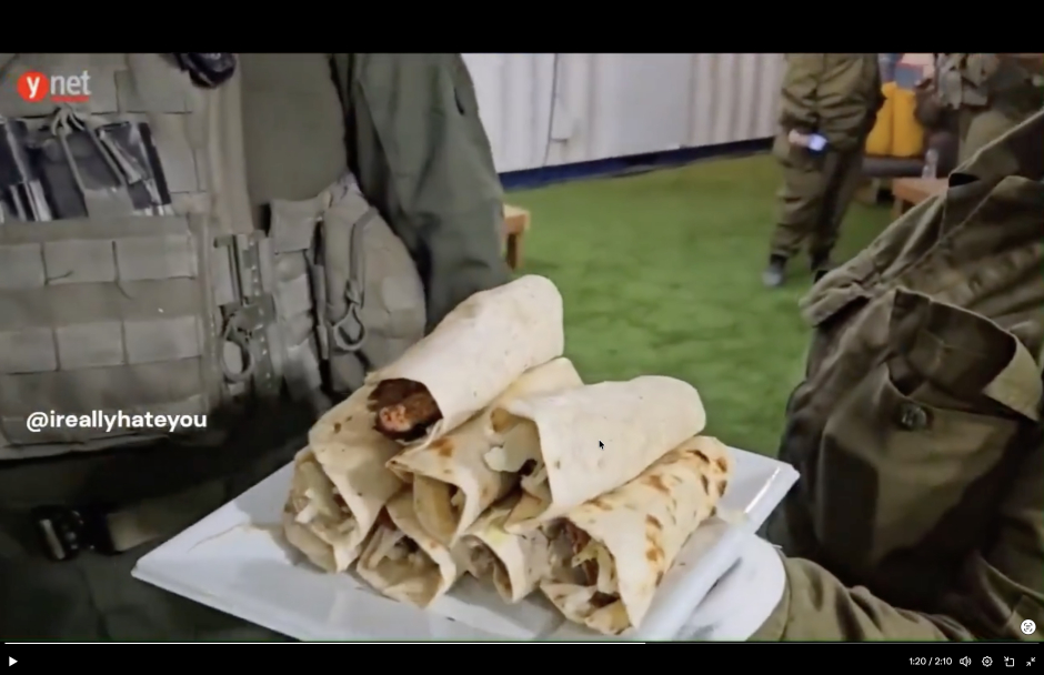 Les images ont été prises en décembre 2024. À quelques centaines de mètres de la population palestinienne endurant la famine, elles montrent le confort obscène proposé aux soldats génocidaires : massages, soins de pédicure, jeux vidéos et bouffe en-veux-tu en)voilà.