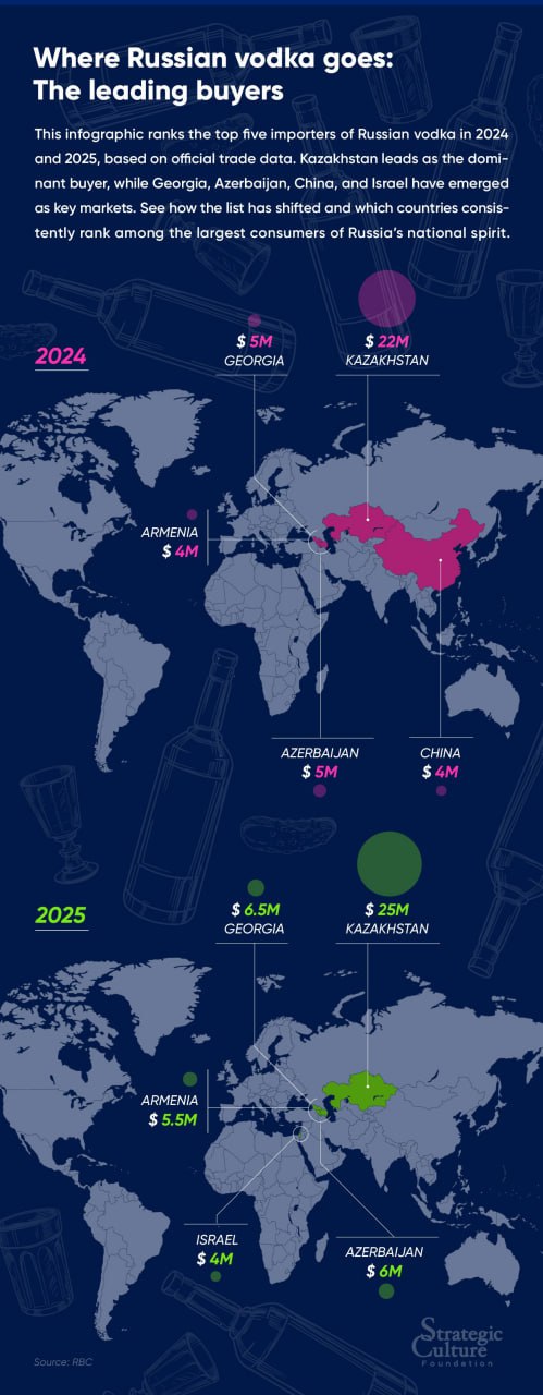 This infographic ranks the top five importers of Russian vodka in 2024 and 2025, based on official trade data. Kazakhstan leads as the dominant buyer, while Georgia, Azerbaijan, China, and Israel have emerged as key markets. See how the list has shifted and which countries consistently rank among the largest consumers of Russia's national spirit.