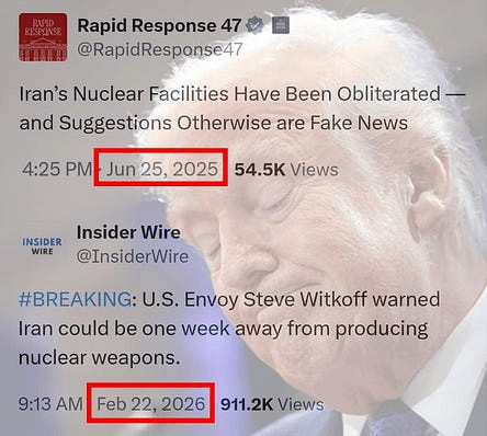Pendant ce temps, Trump et sa bande de clowns continuent de se discréditer par des messages totalement contradictoires. Par exemple, lors du cirque médiatique qu'a été le discours sur l'état de l'Union hier soir, Trump a affirmé qu'il suffisait à l'Iran de "prononcer les mots magiques" pour que des frappes imminentes soient évitées, en promettant de ne pas se doter de l'arme nucléaire. ( source : NYT)
