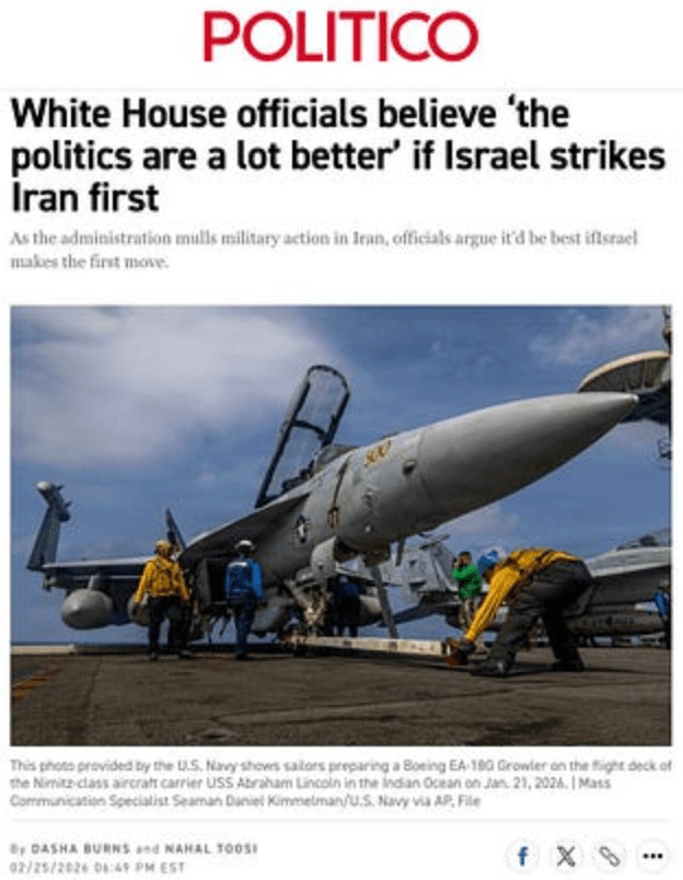 Selon certaines informations, des responsables américains estiment qu'Israël devrait attaquer l'Iran en premier afin de provoquer une riposte iranienne contre les États-Unis ou Israël. Cela permettrait de justifier une guerre américaine, affirment-ils".