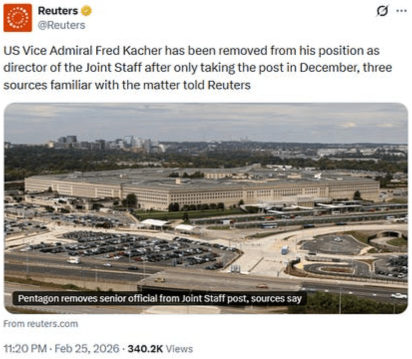 "WASHINGTON, 25 février (Reuters) - Le vice-amiral américain Fred Kacher a été démis de ses fonctions de directeur de l'état-major interarmées après avoir pris ses fonctions en décembre seulement, ont indiqué mercredi à Reuters trois sources proches du dossier.