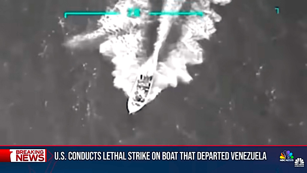 Un hors-bord vénézuélien quelques instants avant l'attaque américaine. (Vidéo de la Maison-Blanche via NBC News)
