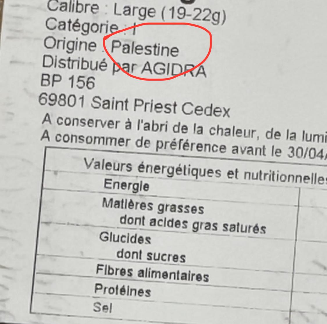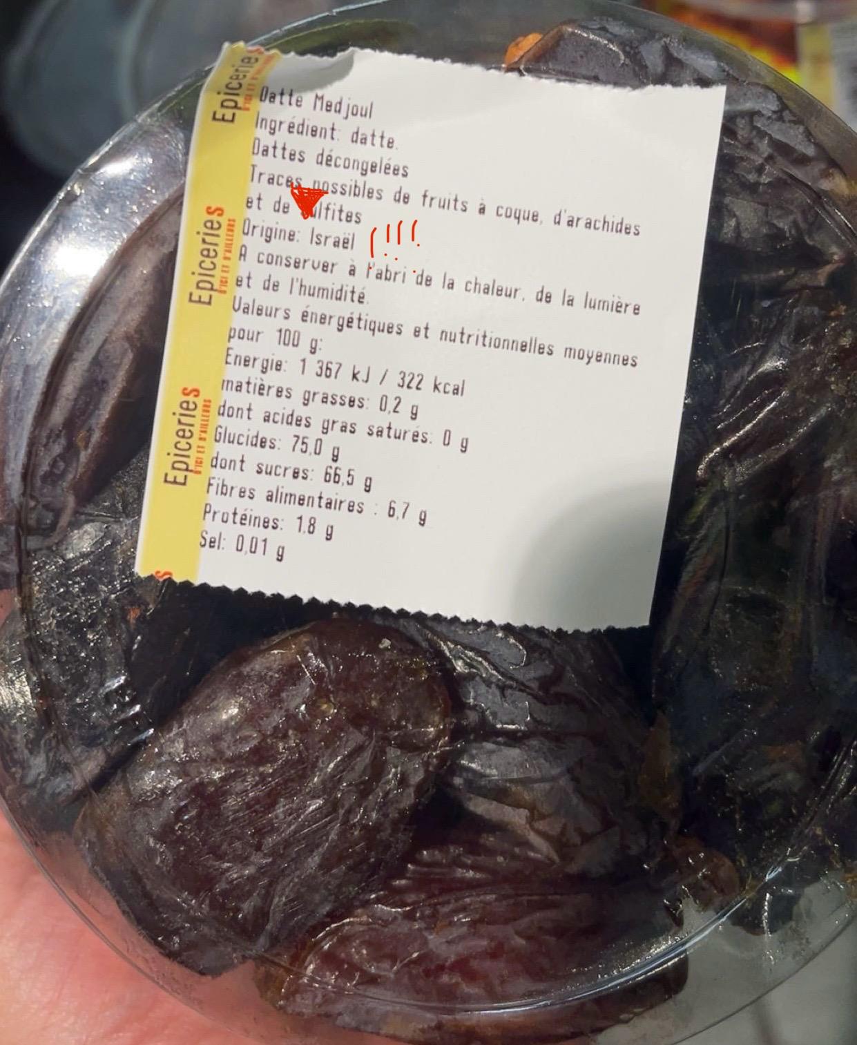 Grand Frais à Voujeaucourt (Montbeliard) triche sans vergogne sur l'origine des dattes Medjoul marquant "Palestine", alors qu'elles ont été exportées par Israël et que l'argent va revenir à l'Etat génocidaire.