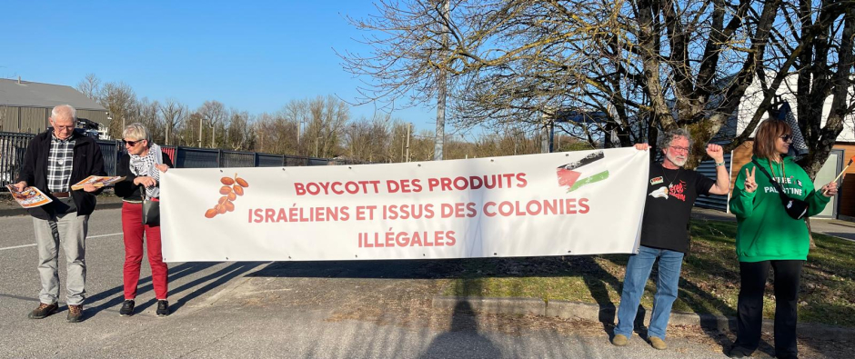 video.europalestine.comEn plus d'une distribution de tracts devant Grand Frais, ils en ont profité pour tester leur nouvelle banderole "Boycott des produits israéliens, issus des colonies illégales" !
