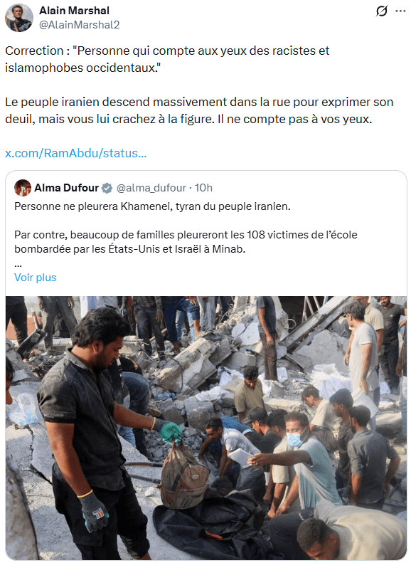 Le rituel suivi par nos édiles est immuable : 1/ se féliciter de la "mort" (ne surtout pas dire "assassinat") de Khamenei ; 2/ après avoir ainsi apporté une justification à la guerre d'agression américano-israélienne, crime suprême selon le tribunal de Nuremberg, et validé les éléments de langage grotesques et abjects des criminels contre l'humanité que sont Trump et Netanyahou sur la prétendue "dictature des mollahs", proclamer la main sur le cœur qu'on ne cautionne pas la guerre et dissocier artificiellement les autres victimes de ces frappes criminelles, affirmant qu'on est solidaire du peuple iranien (surtout, ne faire aucune référence au fait que ce même peuple est sorti dans la rue par millions pour soutenir son "régime" en janvier, et qu'il a fait de même aujourd'hui, malgré les bombes : ce ne sont pas les aspirations réelles des Iraniennes qui comptent, mais celles que "l'Occident civilisé" souhaite pour elles, et qui veulent le façonner à son image, mentalité coloniale oblige).
