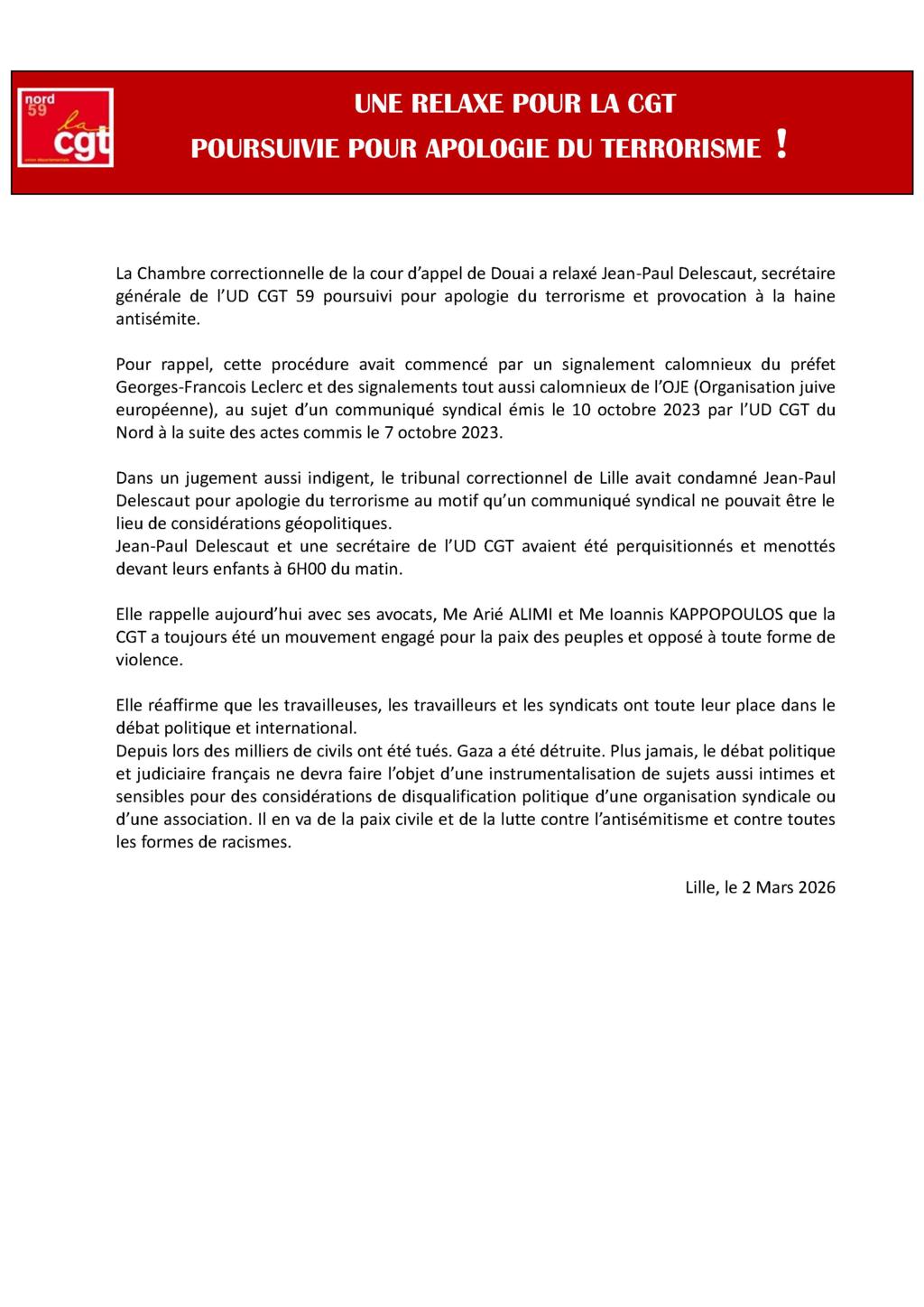 Condamné en première instance à un an de prison avec sursis par le tribunal correctionnel de Lille, après des signalements du préfet Leclerc et de l'OJE concernant un communiqué syndical du 10 octobre 2023 à propos de l'attaque du 7 octobre 2023, Jean-Paul Delescaut de l'UD CGT Nord est relaxé par la cour d'appel de Douai qui a remis les pendules à l'heure !