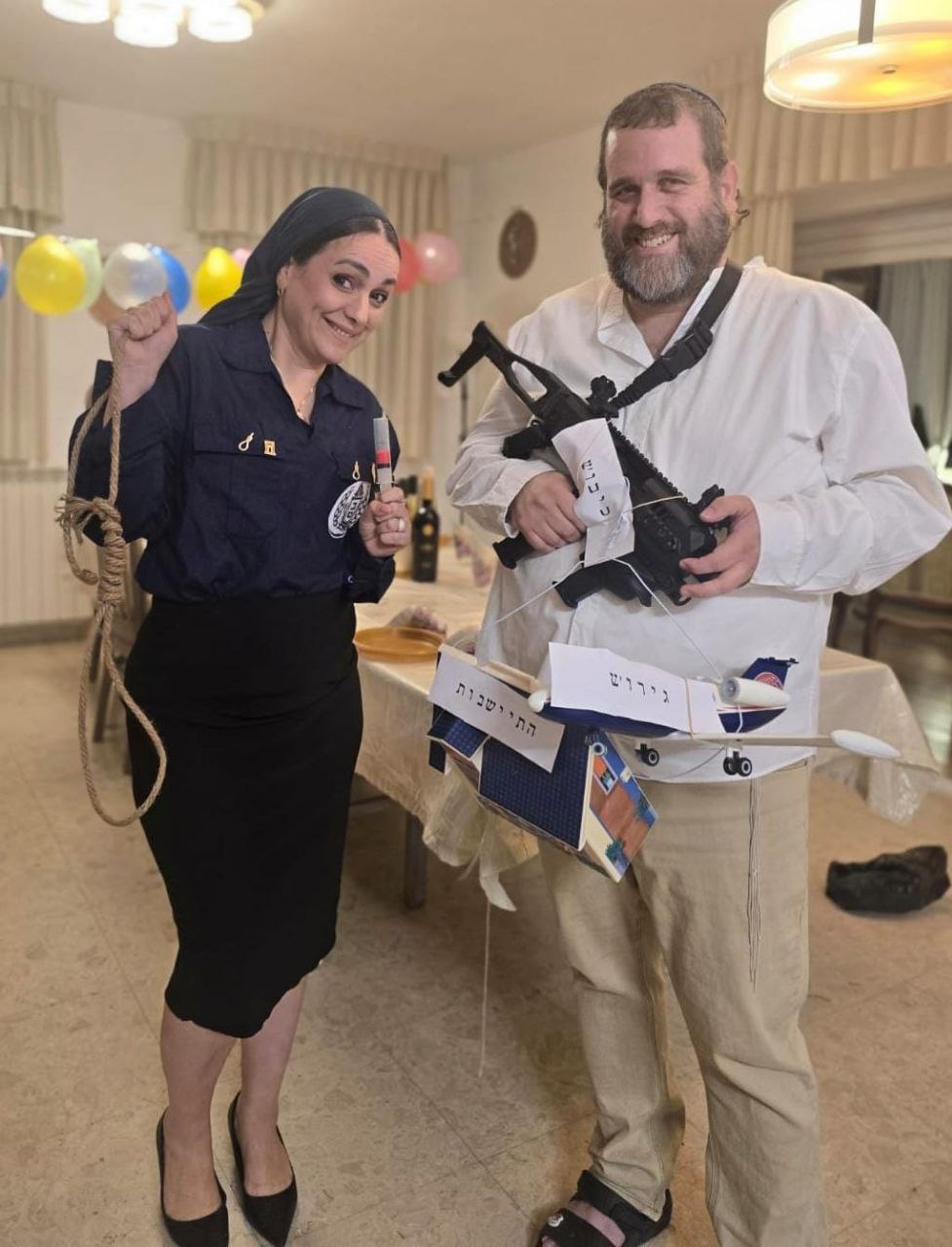 Elle portait un uniforme ressemblant à celui de l'administration pénitentiaire israélienne, ainsi que des insignes représentant un nœud coulant et le "Troisième Temple". Elle tenait à la main un nœud coulant et une seringue.