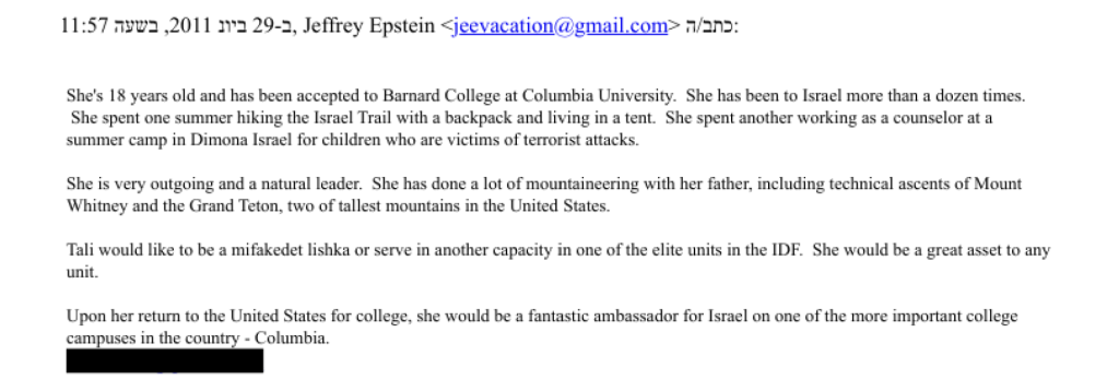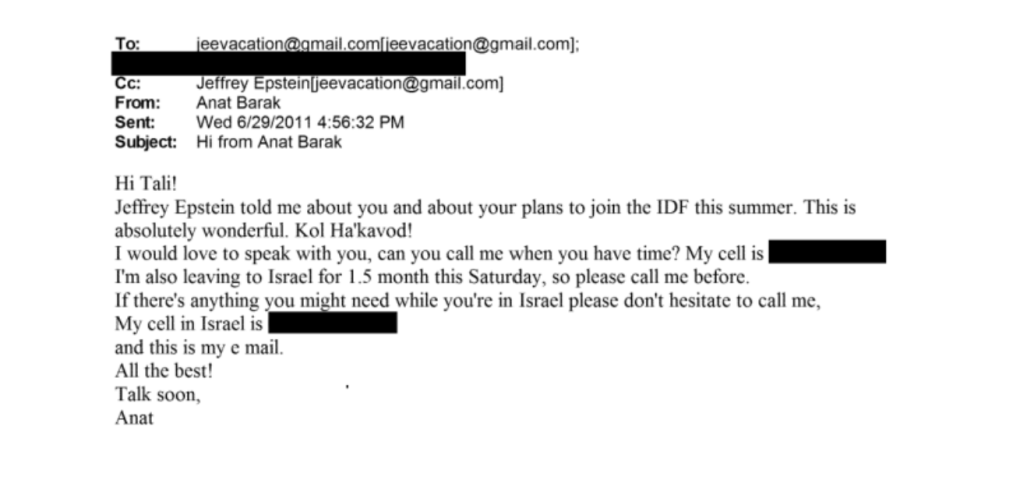 While Lefkowitz's exploits in the upper echelons of the Zionist movement are public, it was unknown until now that she received assistance from Jeffrey Epstein, who despite having no apparent military or special forces experience himself, was seemingly able to arrange her acceptance into "one of the elite IDF units." The emails between Epstein and Anat Barak raise serious questions about nepotism in the Israeli military's recruitment process.