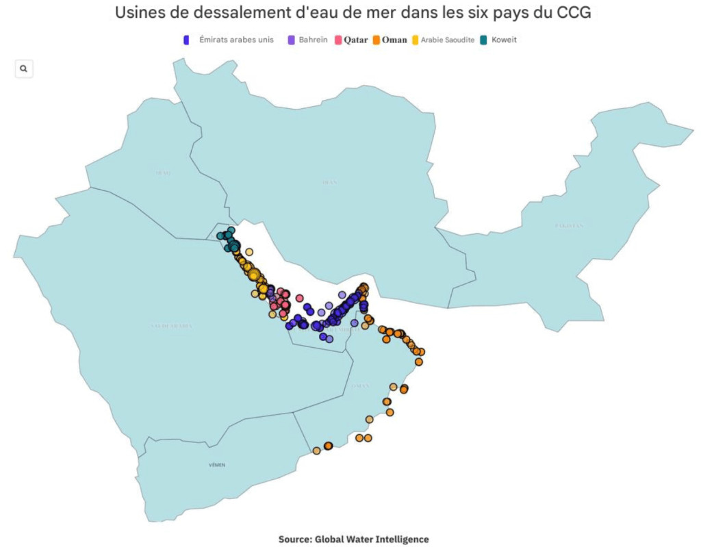 Selon les estimations, le Qatar obtient près de 100% de son eau potable par dessalement, Bahreïn et le Koweït environ 90%, l'Arabie saoudite environ 70%, et les Émirats arabes unis 42%. Ces cinq pays comptent environ 58 à 60 millions d'habitants. La plupart d'entre eux vivent dans les grandes villes - Riyadh, Djeddah, Dubaï, Abou Dhabi, Doha, Koweït, Manama - où l'accès à l'eau dépend de quelques complexes côtiers qui pompent l'eau par des tuyaux sur des centaines de kilomètres dans le désert.