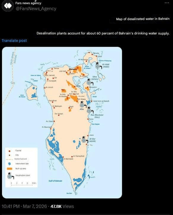 Aujourd'hui, un compte d'agence de presse affilié aux Gardiens de la révolution a publié une menace à peine voilée contre les installations de dessalement de Bahreïn :